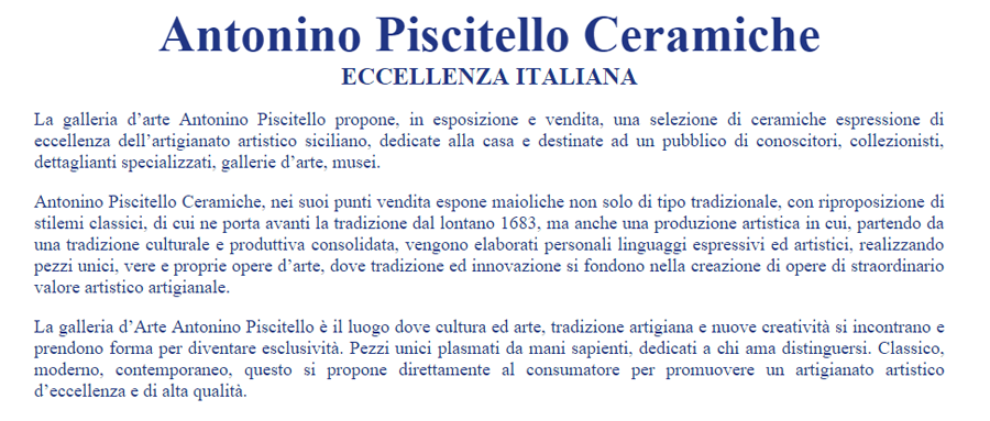 La fabbrica di ceramiche Antonino Piscitello si è sempre ispirata alle botteghe che nel Rinascimento hanno fatto grande l’Italia, puntando su un’intelligenza delle mani che diventa cultura. Così, nella bottega dei colori, dove si preparano le varie tonalità, la storia si accoppia con l’alchimia, perché le varie tonalità di blu vanno di pari passo con l’evoluzione della terracotta invetriata, e la matematica e la chimica servono a contare le molecole degli smalti. In quella dell’argilla e del cotto la scienza si applica ai materiali, la storia dell’arte ai piatti e agli oggetti d’arredamento, e gli stili c’entrano con la letteratura, la matematica con l’età della materia argillosa, o le miscelazioni degli ossidi metallici, per creare splendori e bellezza. Insieme lavoro e studio, tra teoria e pratica. Il tutto senza risparmio di tecnologia.